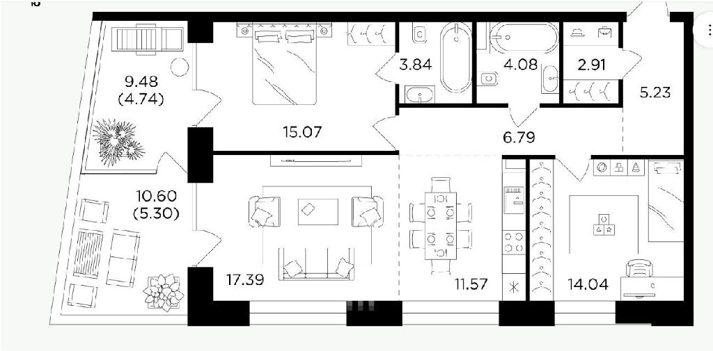 - 2 (или 3) изолированные спальни между которыми расположена просторная кухня-гостиная более 30 метров для большей приватности спален